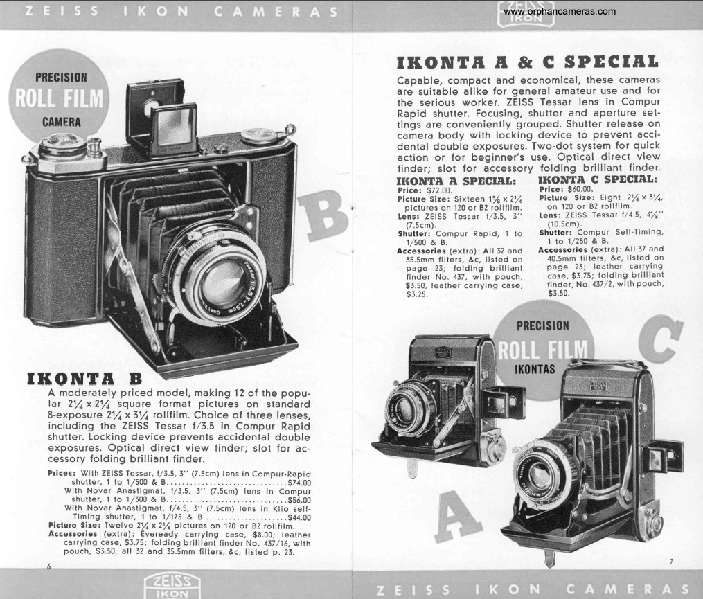 ลองค้นหารายละเอียด ของกล้องตัวนี้ พบโบร์ชัวร์ ที่แสดงรายละเอียดของกล้องรุ่น IKONTA นี้ มีผลิตออกมา 3 ขนาด ทั้งหมด ใช้ฟิล์มม้วน 120 หรือ B2 ที่มีขนาดกว้าง 6 ซม. ความยาว ตามขนาดของกล้อง ตามรุ่นที่ผลิต ดูรายละเอียดแล้ว IKONTA A (คือตัวนี้) เป็นขนาดเล็กสุด ถ่ายรูปได้ขนาด 1 5/8 x 2 1/4 นิ้ว มาพร้อมกับเลนส์ Zeiss Tessar f/3.5 7.5cm. ชัตเตอร์ Compur Rapid ความเร็วชัตเตอร์ 1 - 1/500 วินาที และ โหมด B (Blub) ราคาขายอยู่ที่ $72.00 ในปี 1938 เทียบเท่ากับประมาณ $1,611.90 ในปัจจุบัน (2024) คิดเป็นเงินไทย ก็ประมาณ 55,500.00 บาท
